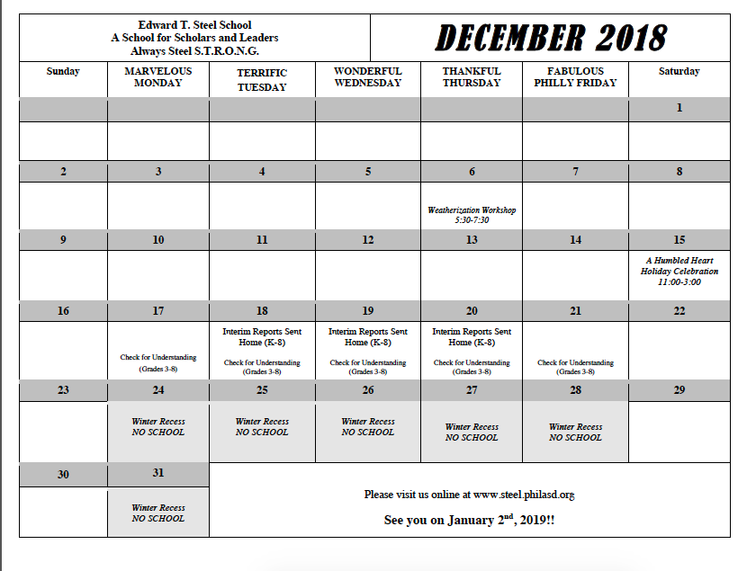 December 2018 calendar